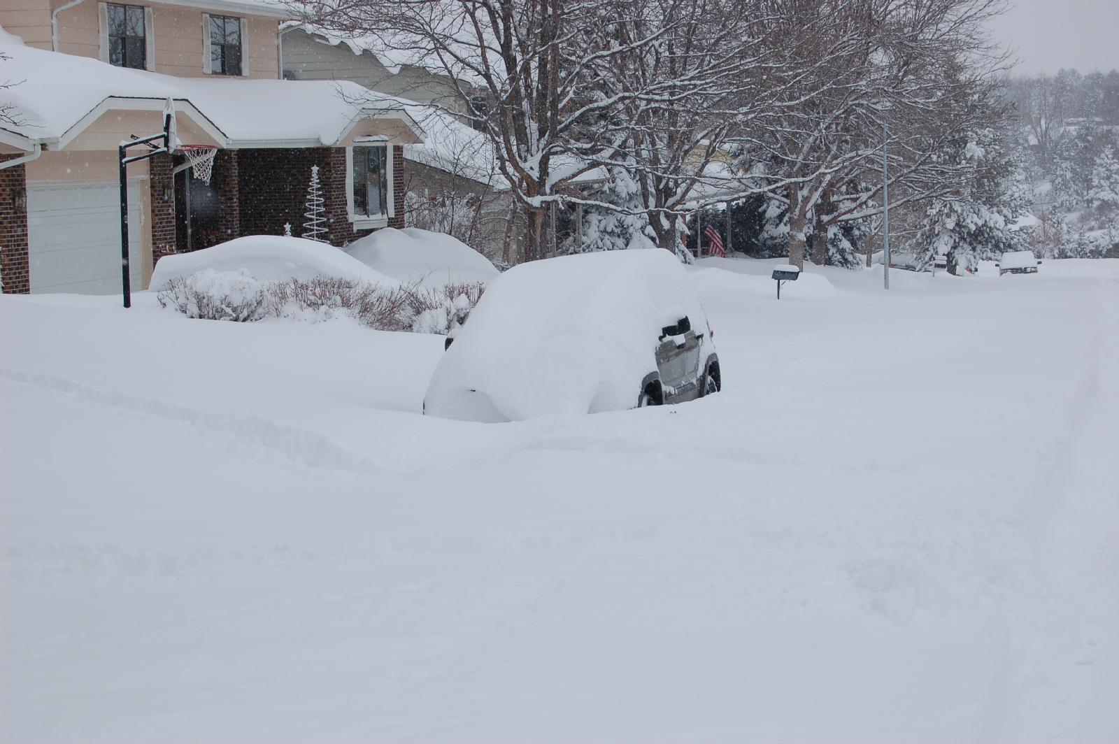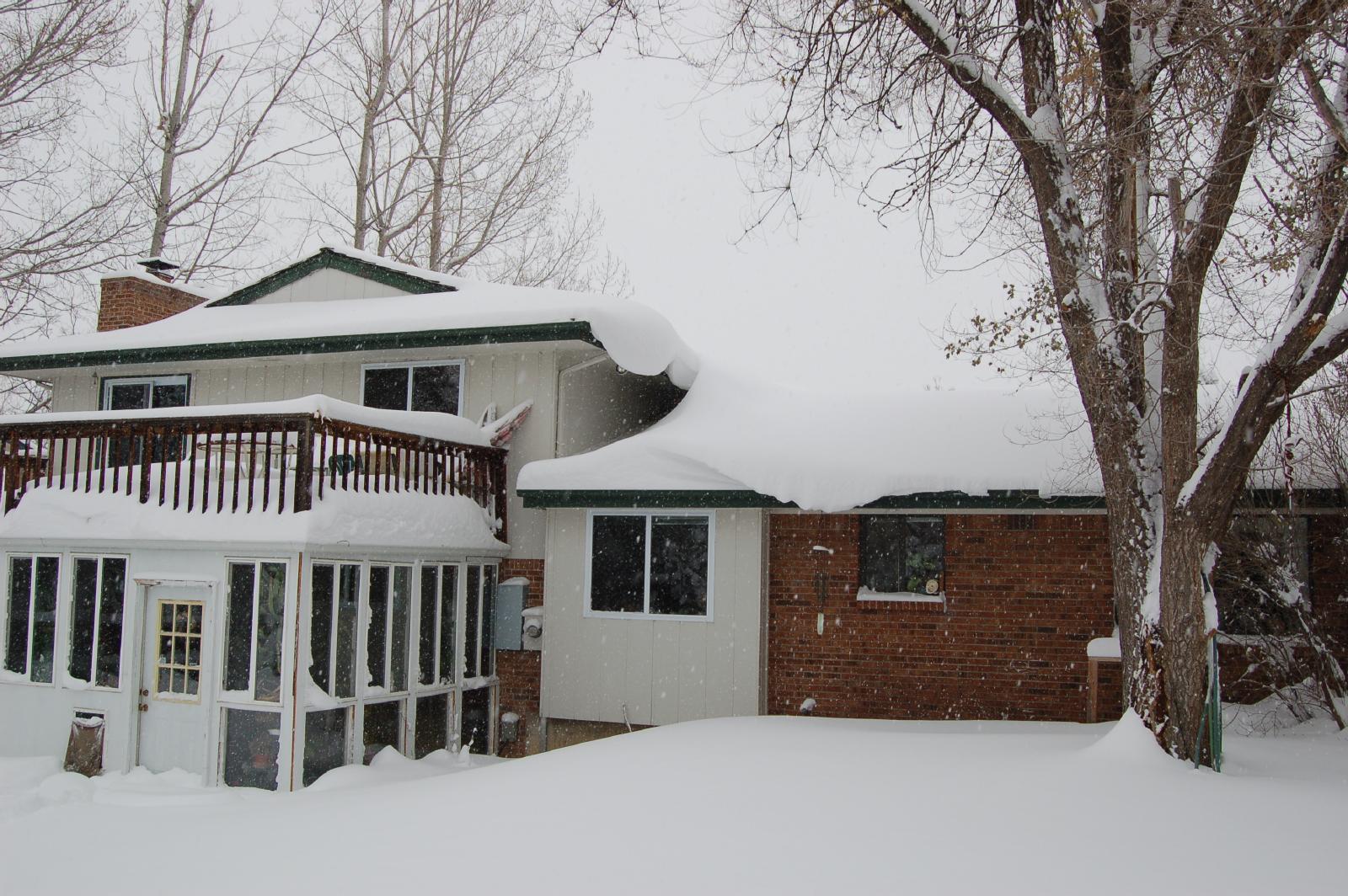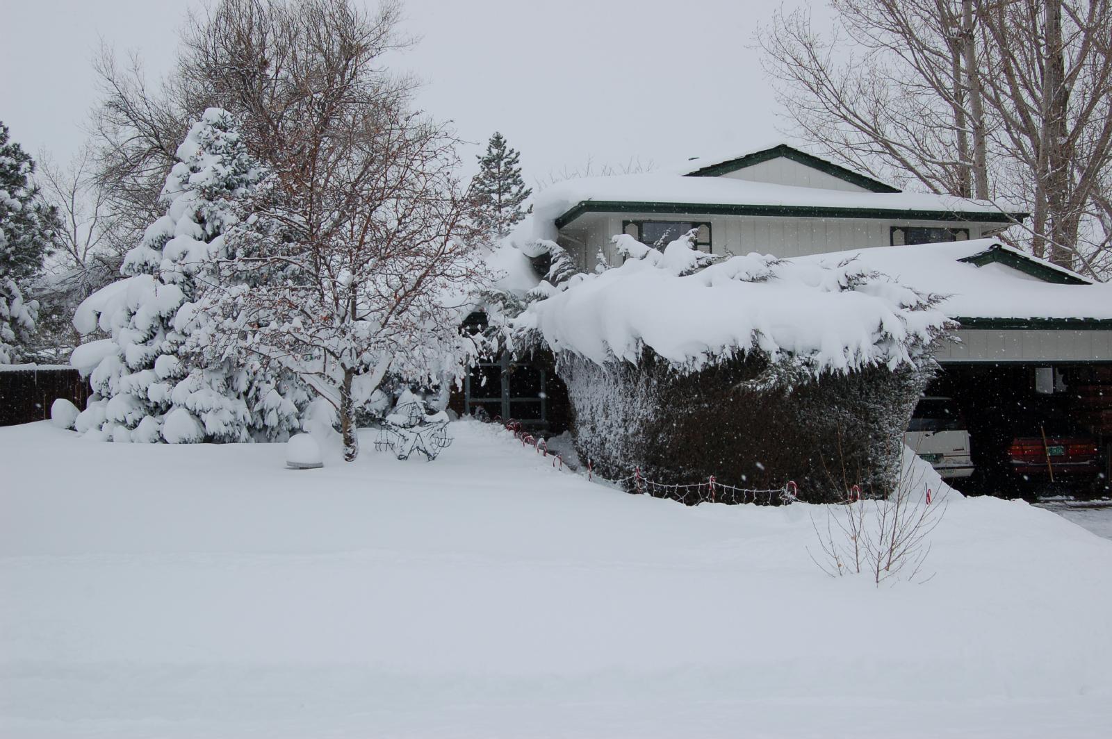 These next pictures show the back of the house (check out the snow overhang from the lower roof), and the front of the house. If you look carefully, you can actually see the tops of the candy-cane lights that run up the sidewalk. As you can see, we had somewhere between 20 and 30 inches of snow. Just enough to make it hard for a neighbor to get his car out (or to even FIND his car). The only reason we were able to get out of the neighborhood was that we had a kind neighbor who was willing to be a human snow-plow.