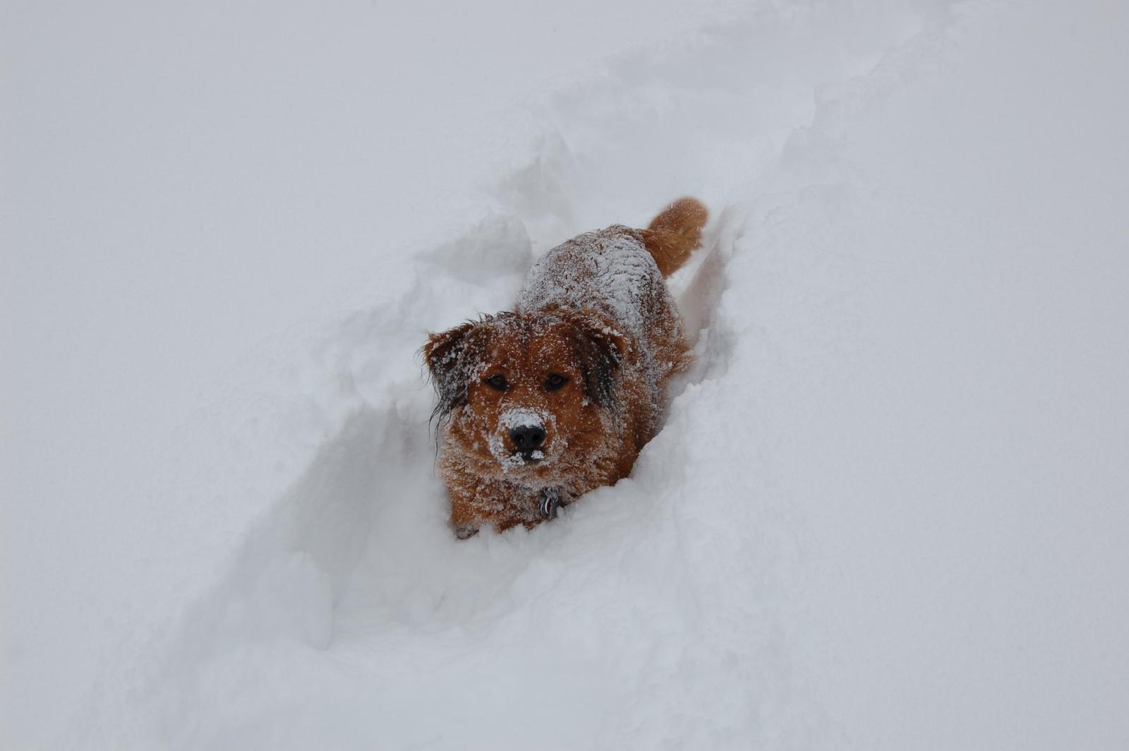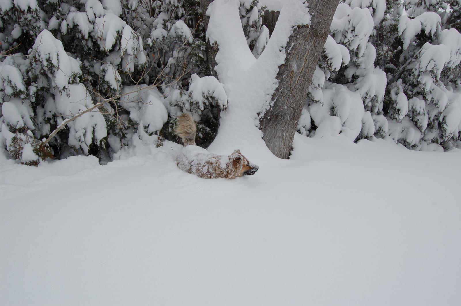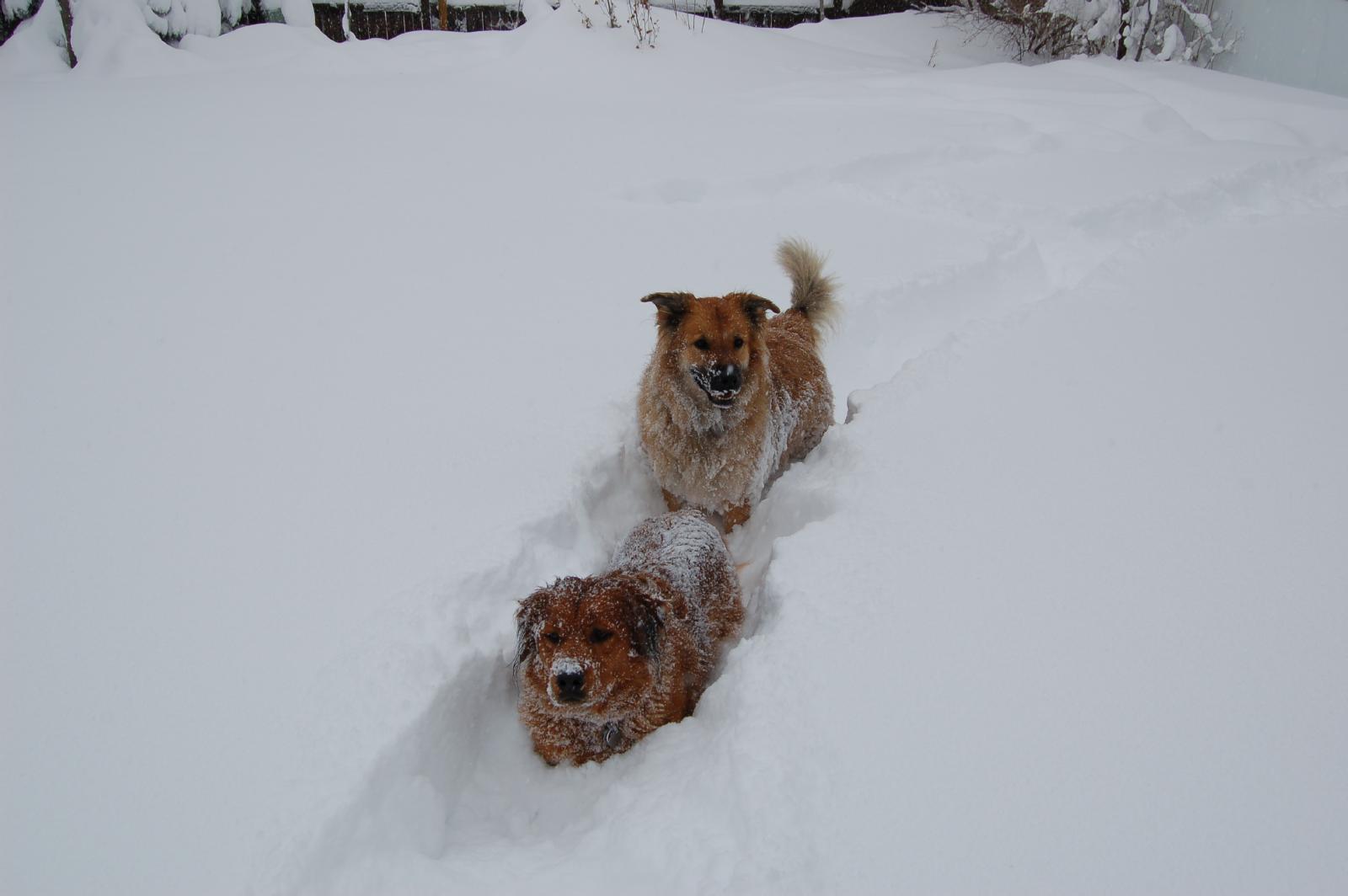 This first picture is one of Bebo in the back yard. One thing to remember through our tour is that before the snow started to fall, there was NO snow on the ground at all. Nada. Nil. It is now over her shoulders. This next picture shows Madra in the back yard, looking around for the pesky squirrel that she just KNOWS is somewhere. And here we have one more, of both dogs.