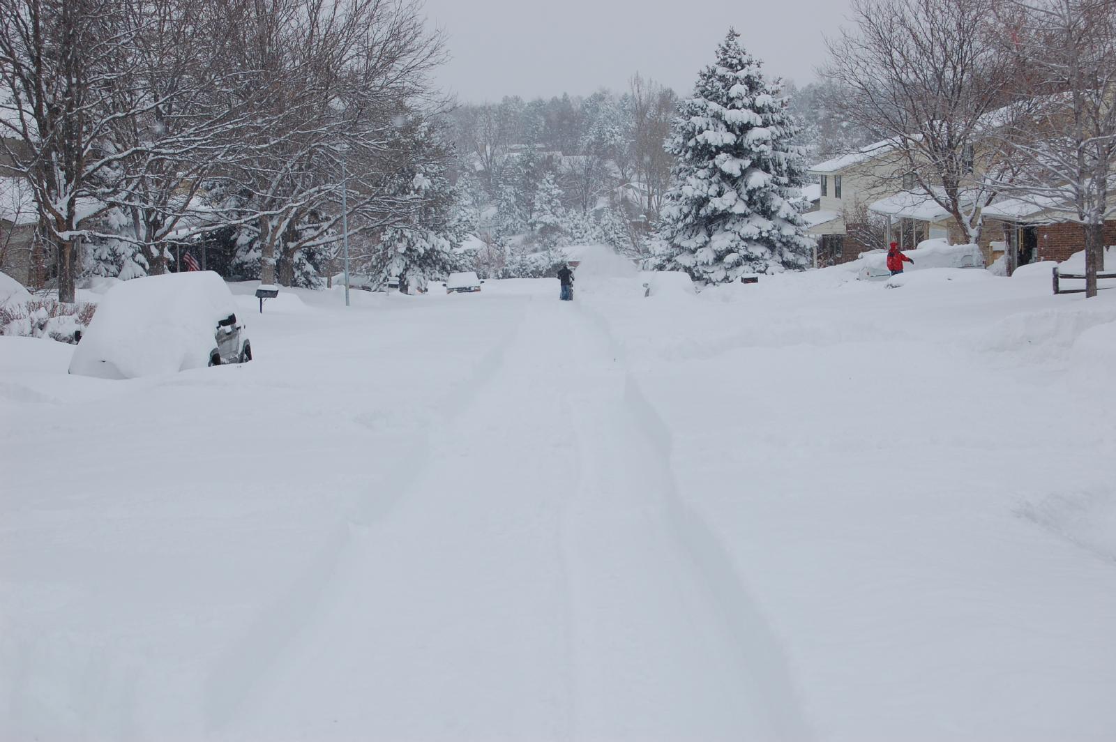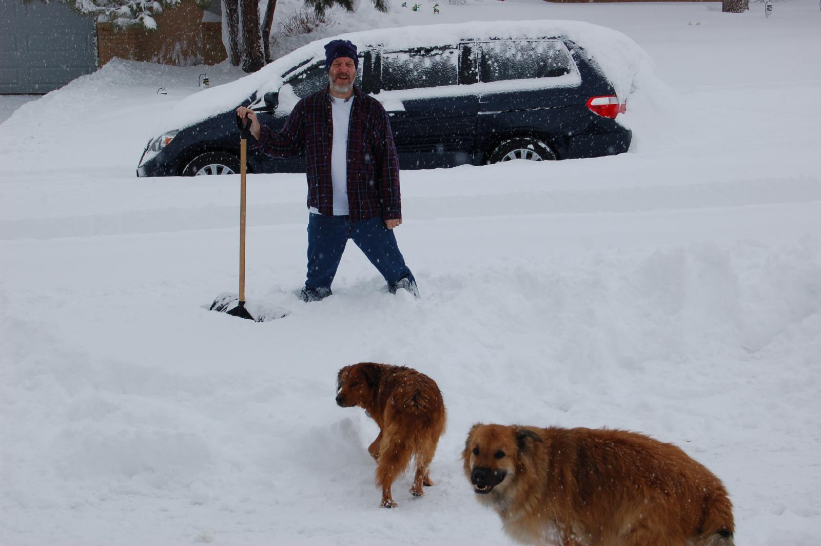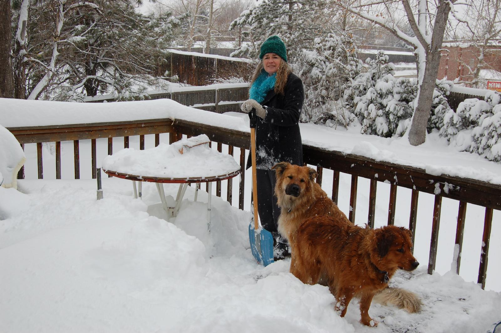And just in case you have forgotten who WE are, here we have Kelly shoveling the back deck (notice the PILES of snow on the trees in the background, and Jim shoveling in the street in front.